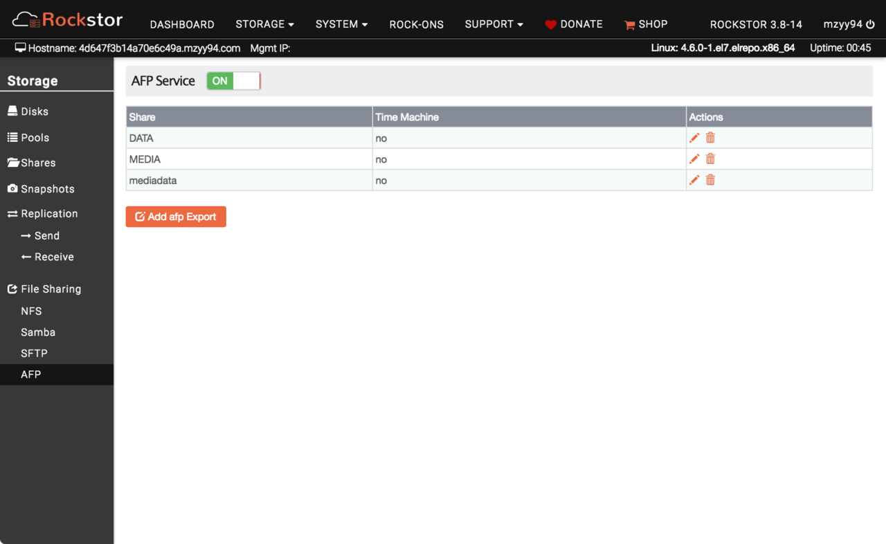 Rockstorの旨みはBtrfs採用でファイル共有ができるNASというところにとどまりません。 アプリケーションの追加を手軽に行うRock-onsと呼ばれる機能があるのです。 Rock-onsは、アプリケーションをDockerコンテナで実行し、Rockstorの環境を汚すことなく 様々な機能をボタン一つで追加する機能です。 FreeNASにもJailとしてアプリケーションをコンテナに押し込む方法がありますが、コマンド入力が多々必要だったり、 そもそも設定するためにメニューを探してはさまざまな情報を入力させられるなど、手軽とは言い難いものです。 対してRock-onsは、あらかじめRock-onsレジストリに登録されたアプリケーションしか標準では実行できないものの、 登録されているアプリケーションであればボタン一つでポチポチと進めていくだけでアプリケーションを動作 させることができるのです。